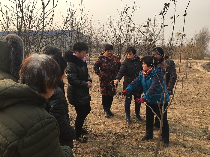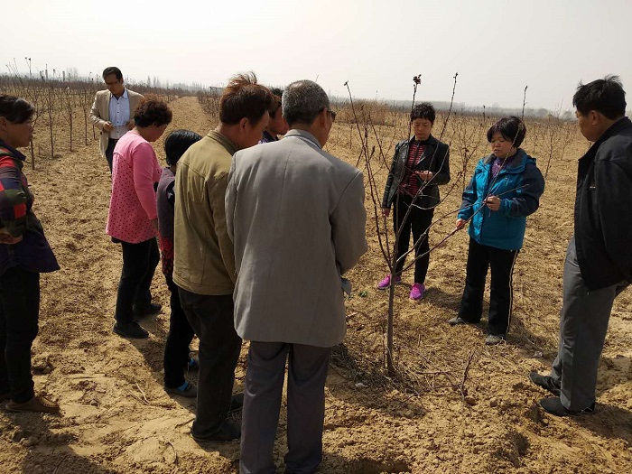 是果树生产关键期,适时指导果树管理,为果树早果丰产打下良好基础。冬季及时清理果园的杂草,进行树盘覆盖;上冻前全园浇封冻水,利于树体充足休眠和提高抗冻能力;树干涂白涂剂,减小树体伤害,杀灭在树皮缝中越冬的虫卵及病菌,减少翌年病虫害发生;春季及时施肥浇水、拉枝刻芽、摘心、疏花疏果;夏季适时除草、追肥;预防病虫害等。二搞好果树管理技术培训,提高果农科学管理实际操作水平。室内结合ppt向果农培训《苹果密植高效无公害栽培管理技术》、《桃树栽培管理技术;室外培训包括苹果、桃、葡萄等果树的修剪、拉枝、刻芽等技术培训。共计培训6期,189人次。培养合作社技术骨干12名以上。果农苹果、桃、葡萄管理水平得到进一步提升。发放技术资料及果树管理实用工具,方便果农学习和管理。培训资料包括果树管理书籍、手册、明白纸及学习用品笔记本、笔发放《苹果优质丰产栽培实用技术》、《葡萄栽培关键技术》、《樱桃优质丰产栽培实用技术》、《苹果密植高效无公害栽培管理技术》等果树管理书籍及手册200余份;《南寺郭村苹果年周期管理工作历》、《无公害果品生产严禁和限制及允许使用哪些农药》、《果园农药杀菌剂的科学分类与规范使用》、《提高果园肥料利用率的技术措施》《南寺郭村苹果年周期管理工作历》、《无公害果品生产严禁和限制及允许使用哪些农药》、《果园农药杀菌剂的科学分类与规范使用》、《提高果园肥料利用率的技术措施》葡萄、桃、樱桃、苹果等果树遭遇“倒春寒”精准补救措施明白纸570份;修剪工具(包括剪枝剪、手锯、刻芽刀等)36套。