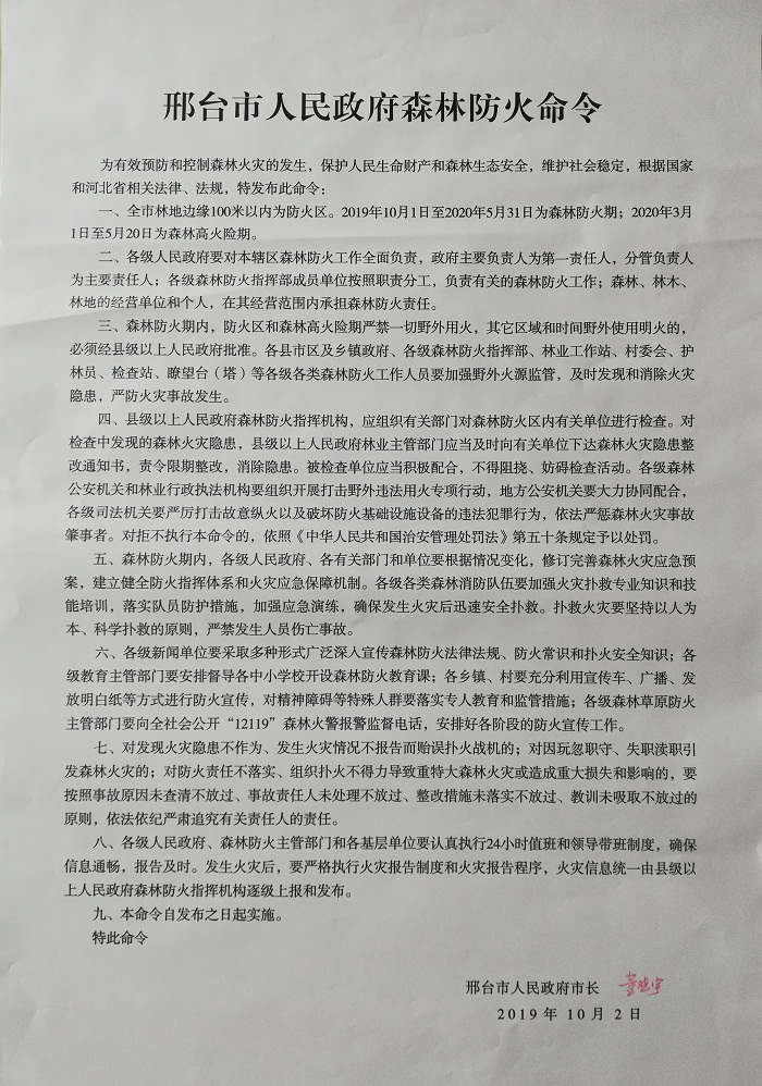 邢台市人民政府森林防火命令