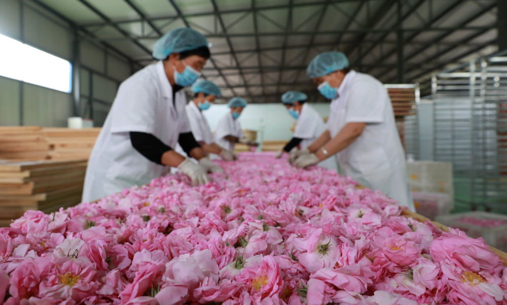 ↑5月14日,邢台市任泽区尚养花湾玫瑰产业园工作人员在筛选准备烘干的玫瑰花。新华社记者 骆学峰 摄