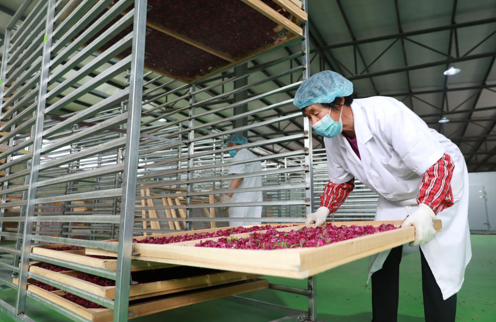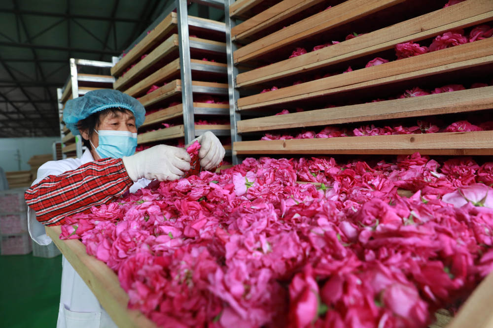 ↑5月14日,邢台市任泽区尚养花湾玫瑰产业园工作人员在筛选准备烘干的玫瑰花。