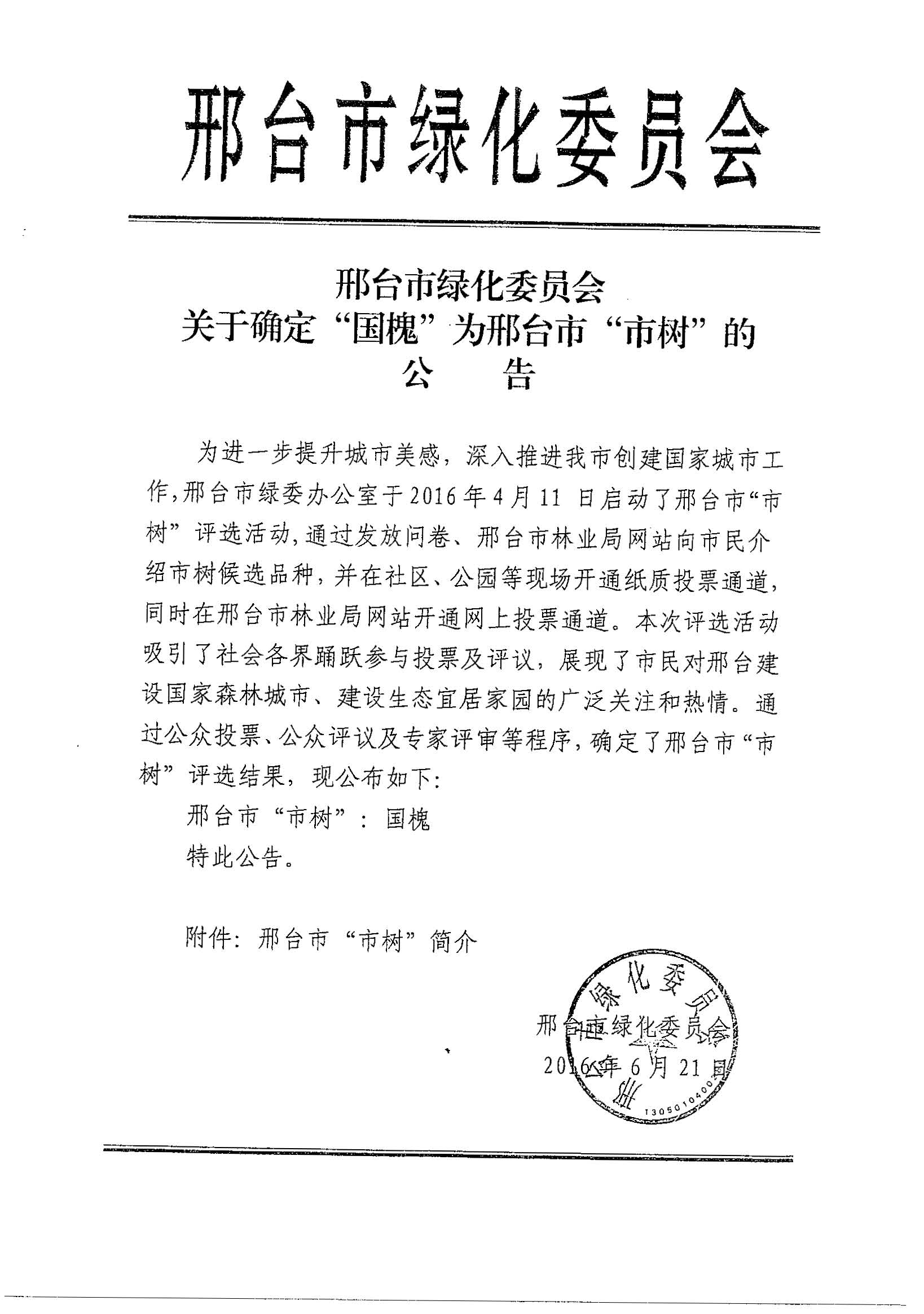市绿委--关于确定国槐为市树的公告
