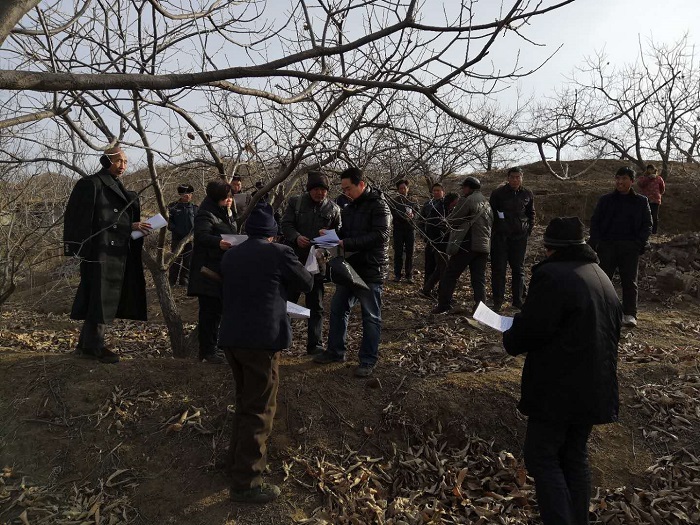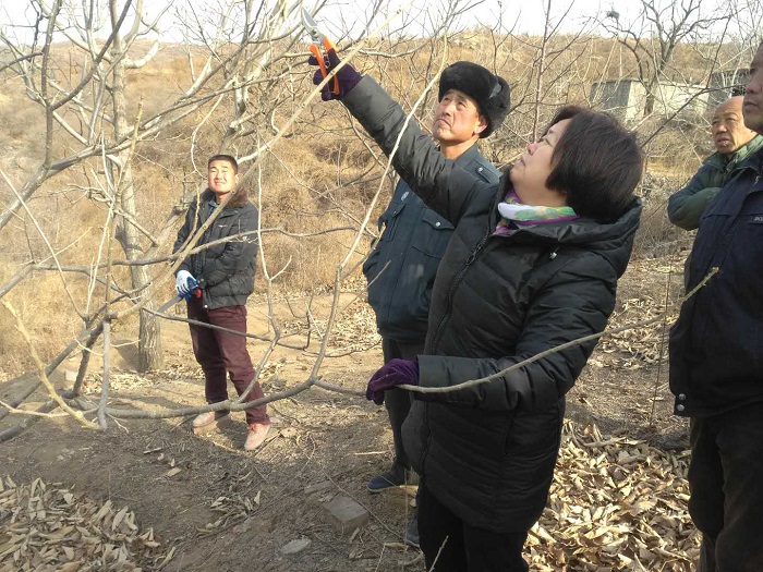 农业技术推广研究员路贺秀带领林果技术人员,到临城县赵庄乡东沟村开展林果技术服务,给果农发放技术资料,并现场讲解培训冬季果树管理技术