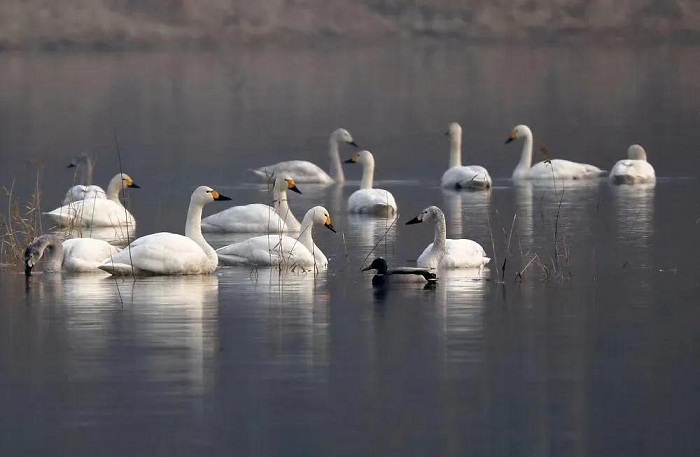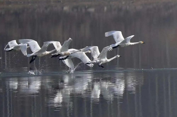 (来源:牛城晚报 记者:陈雷 霍红军 田晓丽 通讯员:张立培)初春时节,一群迁徙的白天鹅途经邢台东川口水库,并在此歇脚。这群白色的精灵有60多只,它们在宁静的湖面上游弋,时而觅食,时而煽动雪白的翅膀,时而成群飞舞,欢快的鸣叫不时传到岸边。