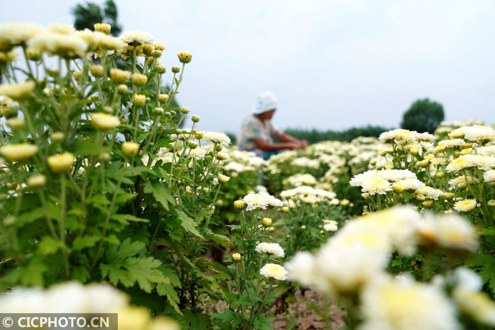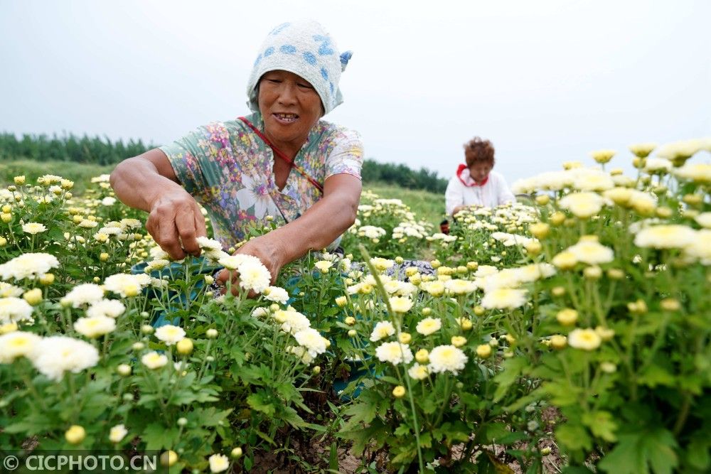 ↑2020年8月31日,在河北省邢台市巨鹿县大屯头村菊花种植基地,农户在采收菊花。CICPHOTO/胡良川 摄