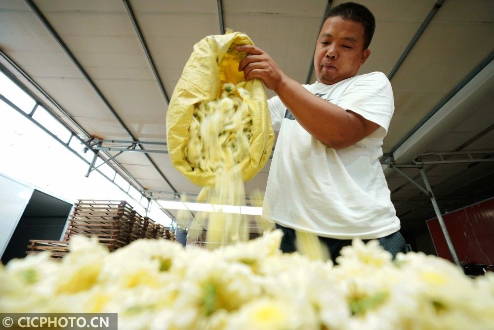 ↑2020年8月31日,在河北省邢台市巨鹿县大屯头村菊花种植基地,农户在收集刚刚采摘的菊花。CICPHOTO/胡良川 摄
