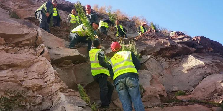 造林队伍中的高帮定今年57岁,加入造林队已有8年时间,他也是这支队伍里年龄最大的一位。“看着亲手种下的树苗慢慢长大特别开心,现在荒山变绿了,空气也好了,沙尘暴天气也很少了。”高帮定说。 王永红与这支悬崖造林队感情深厚。彼此间除了认可这份工作的意义,还有在这种环境里建立的兄弟感情。造林队的工作能够给队员带来不错的收入,还不用背井离乡。这些年,造林队多了一些年轻人。