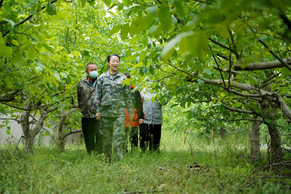 河北临城县泥河村绿岭核桃园里,郭素萍(左二)查看果树生长情况。(临城县委宣传部供图)