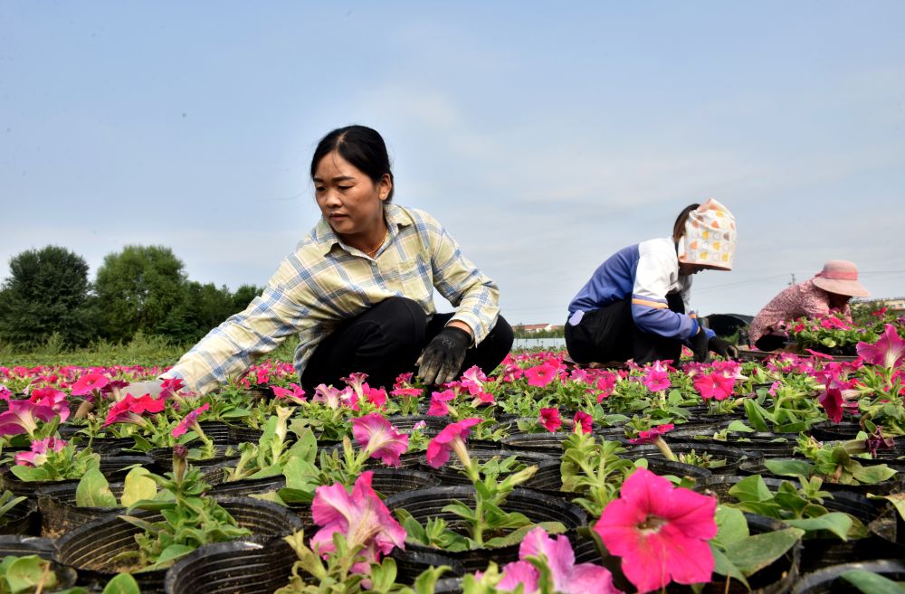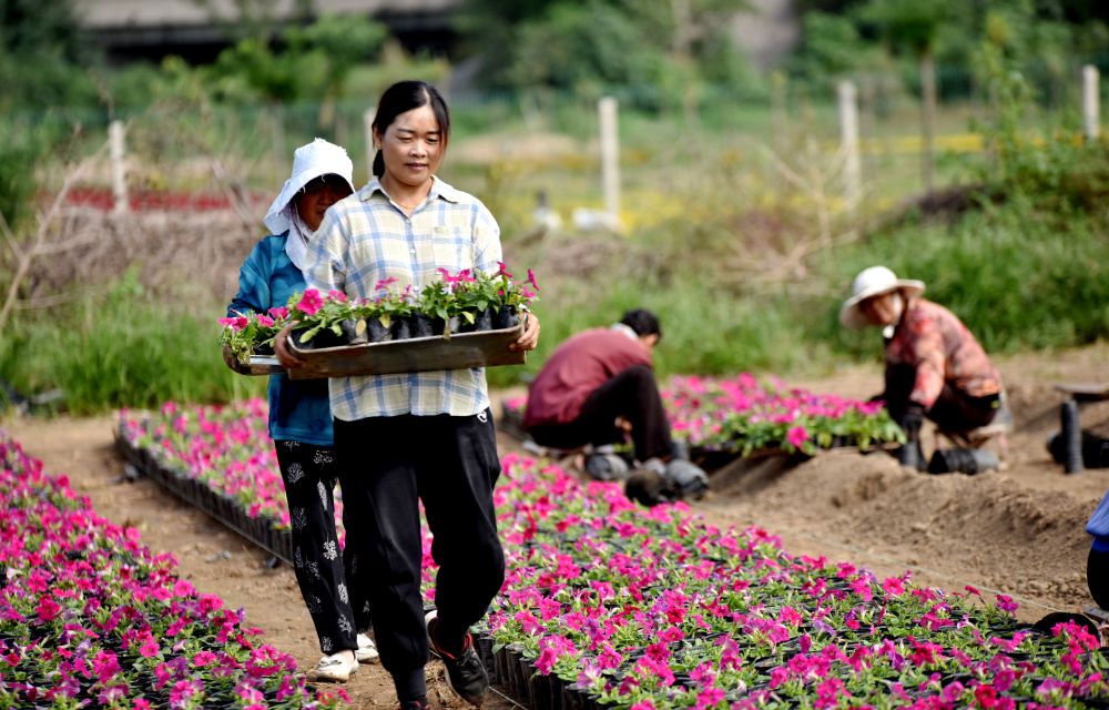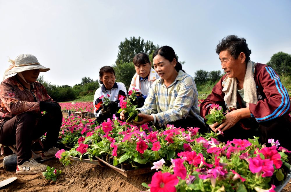 ↑9月22日,王素霞(左二)在花卉基地搬运盆栽花卉。新华社记者 朱旭东 摄