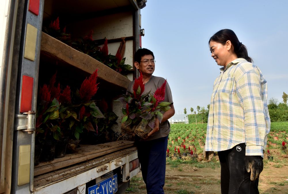 ↑9月22日,王素霞(右)在花卉基地与采购客商交谈。新华社记者 朱旭东 摄