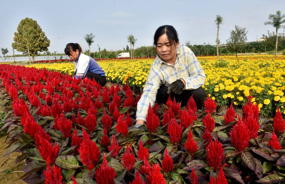 ↑9月22日,王素霞(右)在花卉基地劳作。新华社记者 朱旭东 摄