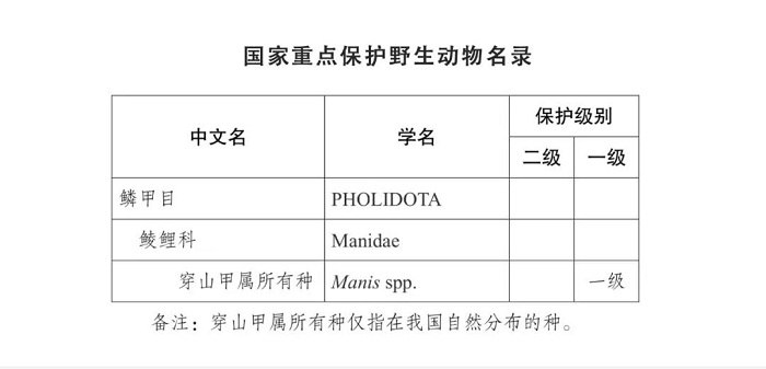 为加强穿山甲保护,经国务院批准,现将穿山甲属所有种由国家二级保护野生动物调整为国家一级保护野生动物(详见附件),自公布之日起施行。